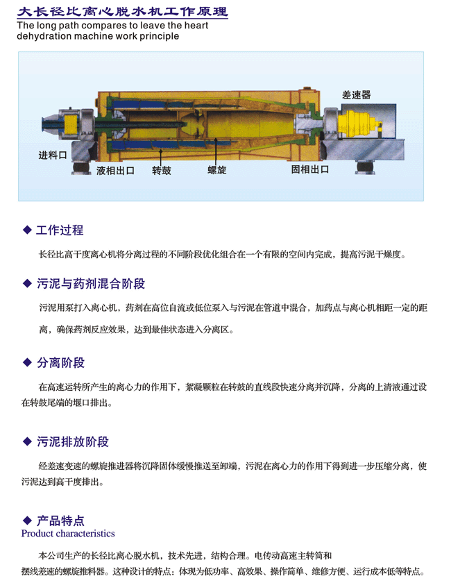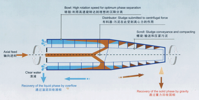 轉(zhuǎn)筒、螺旋推料器同向高速旋轉(zhuǎn),轉(zhuǎn)筒、螺旋推料器在差速器作用下速差為10-30轉(zhuǎn)/分。分離原液經(jīng)進料口進入高速轉(zhuǎn)動的轉(zhuǎn)筒內(nèi),在離心力的作用下液體中質(zhì)量大的懸浮物迅速地向筒壁積聚。已分離的濾液由水層內(nèi)圈之出水孔經(jīng)出液口排出。沉渣由螺旋推料器推送到轉(zhuǎn)筒的圓錐端經(jīng)出渣口排出。