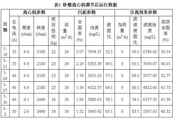 在參數(shù)的摸索調(diào)節(jié)中,轉(zhuǎn)鼓轉(zhuǎn)速過大會造成離心機本體的磨損和增加動力消耗,轉(zhuǎn)速過小,達不到處理效果,在前期運行轉(zhuǎn)速1800r/min的情況下,適當調(diào)節(jié)到2100~2500r/min范圍內(nèi);同時結(jié)合污泥含固率的減少和物料的難分離特性,將差速由前期的8r/min降低到2.5~6r/min范圍內(nèi),延長固體顆粒在離心機內(nèi)的停留時間。調(diào)節(jié)后運行數(shù)據(jù)見表3(選擇上午8時數(shù)據(jù))。