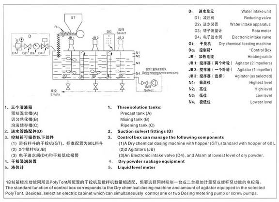 聚合物溶液制備過程是通過各個(gè)溶液箱逐步處理完成的,溶液箱之間隔開,保證每個(gè)溶液箱內(nèi)的最佳反應(yīng)時(shí)間和恒定的濃度,避免在預(yù)制混合槽和溶液儲(chǔ)存槽之間產(chǎn)生任何直接通路。PolyTont由控制箱自動(dòng)控制,此控制箱與安裝在溶液儲(chǔ)存槽上的液位計(jì)相聯(lián),一旦液位達(dá)到“低位”,觸發(fā)電子進(jìn)水閥打開,同時(shí)啟動(dòng)干投機(jī),干投量的大小與水量均可準(zhǔn)確調(diào)定,以獲得精確的濃度。一旦達(dá)到“高位”此循環(huán)過程就停止。當(dāng)然兩個(gè)攪拌器還在工作。