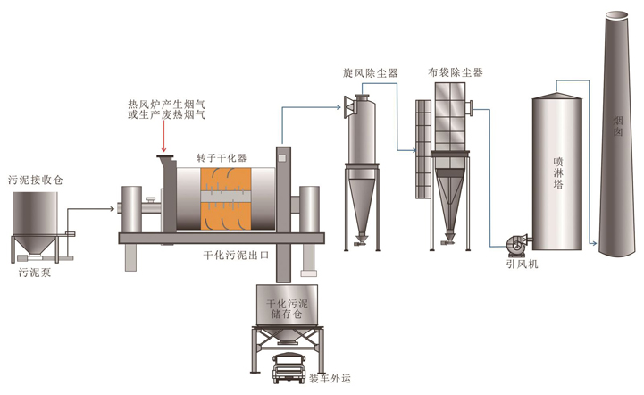 2.脫水污泥被輸送至轉子干化器,通過直接與熱煙氣接觸,在干化器內實現(xiàn)加熱和干化;經(jīng)干化后的物料進入干化污泥儲存?zhèn)}后外運再利用;